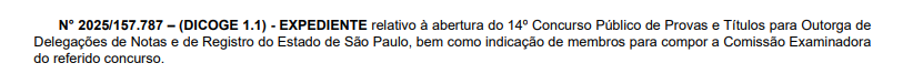 O Estado de São Paulo divulgou o expediente N° 2025/157.787 (DICOGE 1.1), que marca a abertura do 14° Concurso Público de Provas e Títulos para Outorga de Delegações de Notas e de Registro. Confira a publicação: