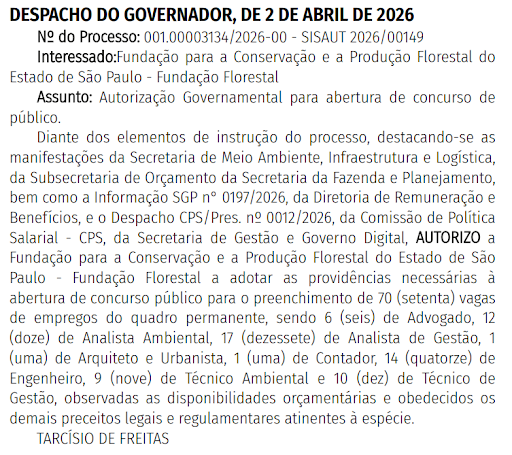O Governo do Estado de São Paulo autorizou oficialmente a realização de um novo concurso público para a Fundação para a Conservação e a Produção Florestal do Estado de São Paulo (Fundação Florestal). A autorização foi publicada em despacho do governador Tarcísio de Freitas, sinalizando o início dos preparativos para a seleção.