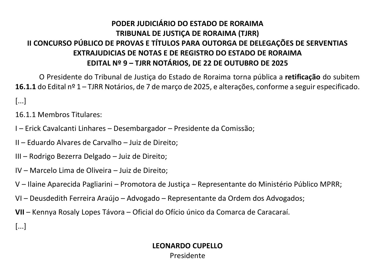 Foi divulgada, em 22 de outubro, uma retificação que atualiza o subitem 16.1.1 do Edital nº 1, de 7 de março de 2025, detalhando a composição da comissão do concurso, composta por desembargadores, juízes, representante do Ministério Público, advogado da OAB e oficial do Ofício Único da Comarca de Caracaraí.