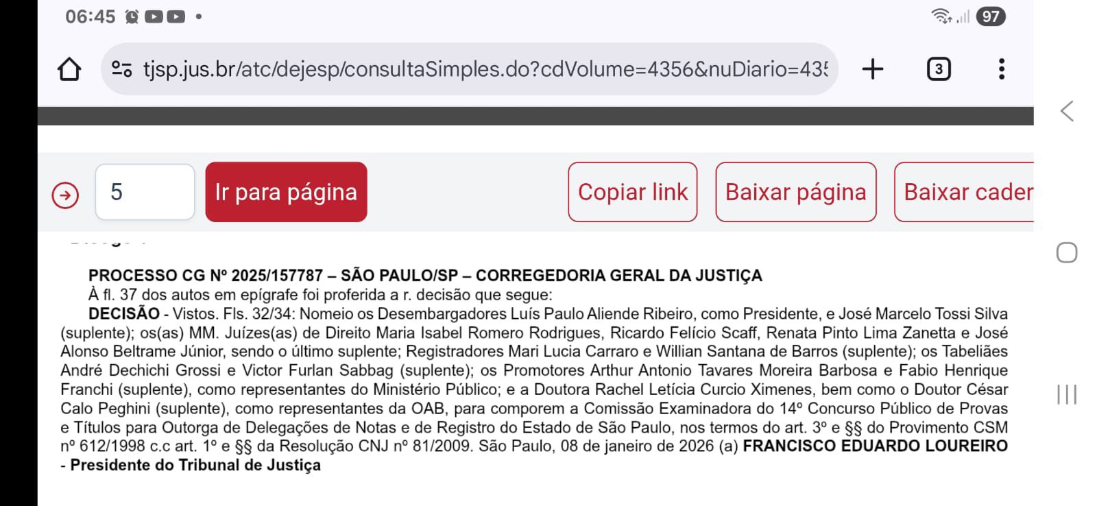 Foi divulgado no Diário da Justiça Eletrônico do Tribunal de Justiça de São Paulo os membros da nova Comissão Examinadora do 14º Concurso Público de Provas e Títulos para Outorga de Delegações de Notas e de Registro do Estado de São Paulo. Confira: