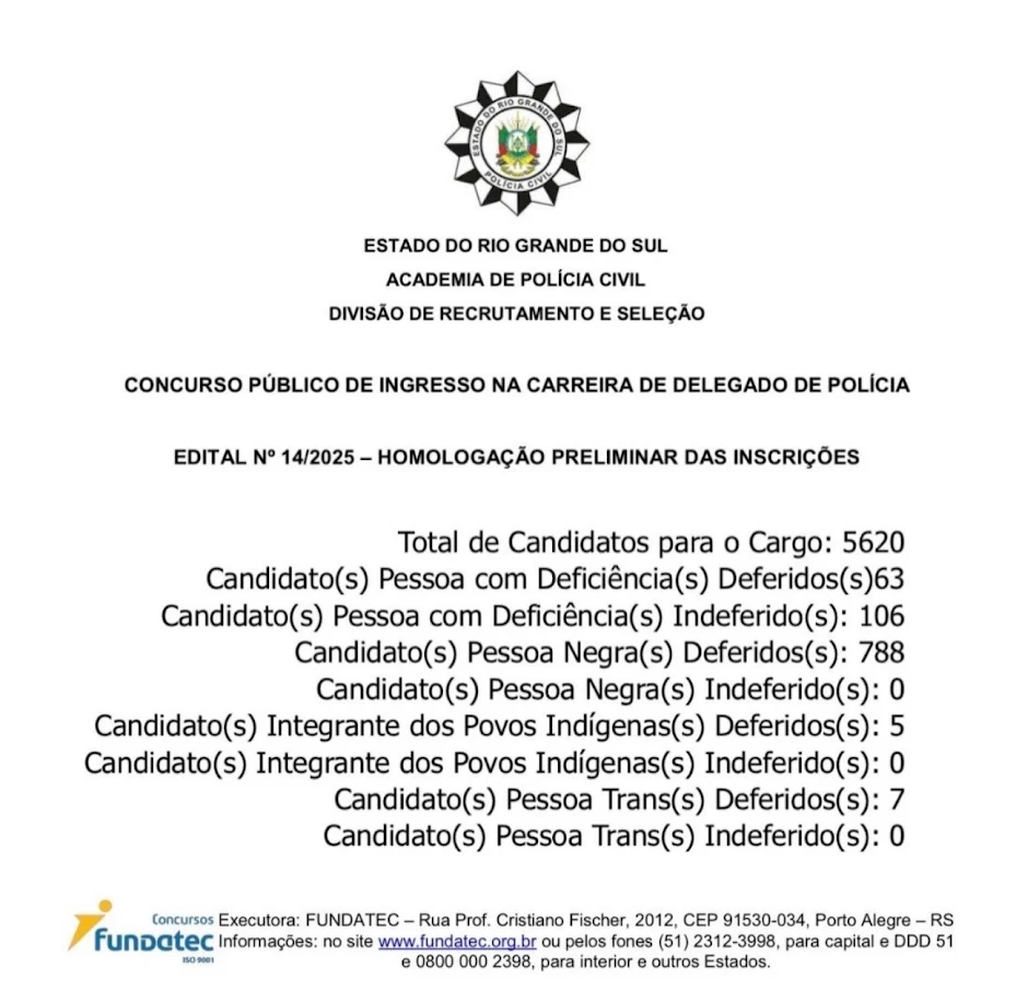 O último concurso para Delegado RS foi realizado em 2018 pela Fundatec, oferecendo 100 vagas e um salário inicial de R$ 20.353,06.