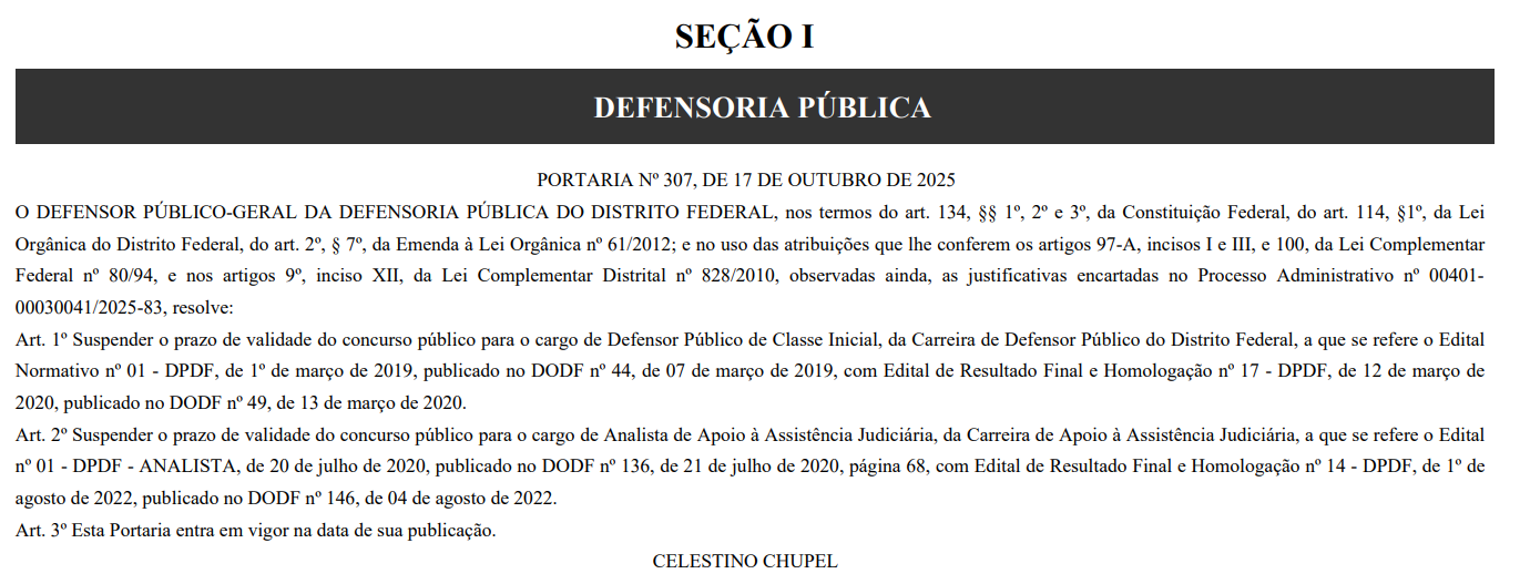 O Defensor Público-Geral da Defensoria Pública do Distrito Federal publicou a Portaria nº 307/2025, suspendendo o prazo de validade do concurso público para o cargo de Defensor Público de Classe Inicial.