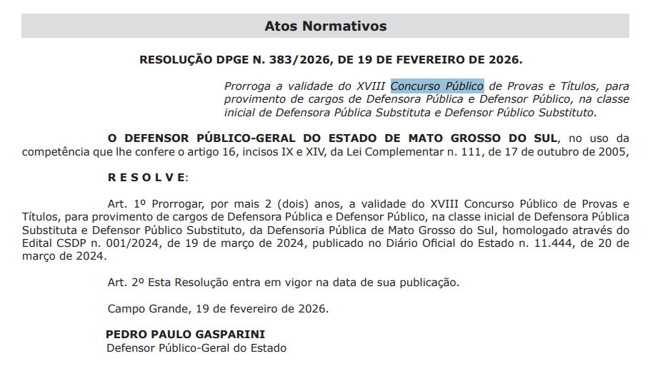 A Defensoria Pública do Estado de Mato Grosso do Sul (DPE MS) publicou documento porrogando a validade do XVIII Concurso Público de Provas e Títulos, para provimento de cargos de Defensora Pública e Defensor Público, na classe inicial de Defensora Pública Substituta e Defensor Público Substituto.