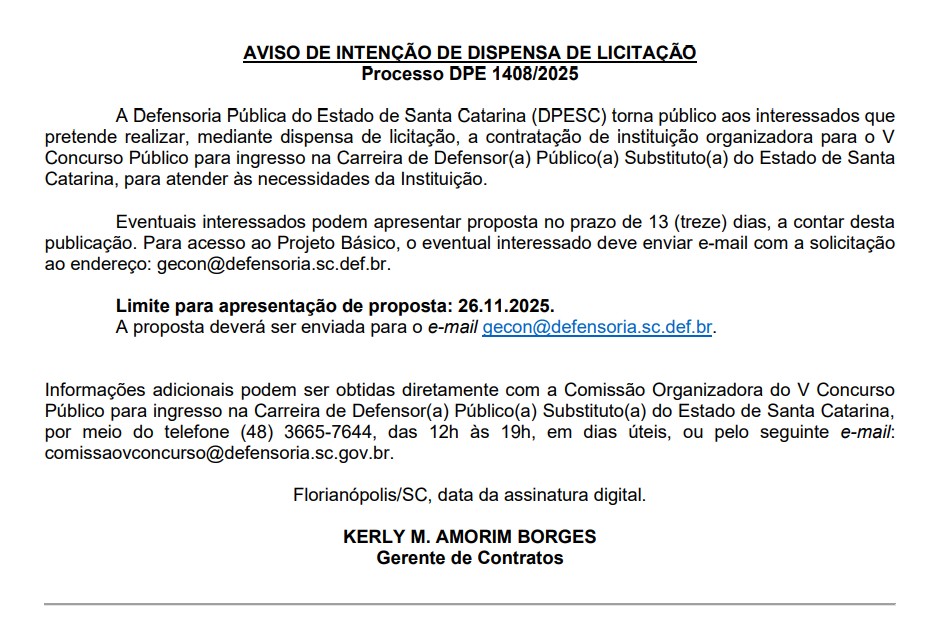 A Defensoria Pública do Estado de Santa Catarina (DPE SC) publicou o aviso de intenção de dispensa de licitação para a contratação de instituição organizadora do V Concurso Público para ingresso na Carreira de Defensor Público Substituto do Estado de Santa Catarina.