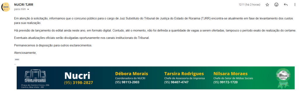 O Tribunal de Justiça do Estado de Roraima (TJRR) comunicou, em retorno a consulta do Estratégia Carreiras Jurídicas, que o concurso para Juiz Substituto encontra-se em fase de análise dos custos para sua realização.