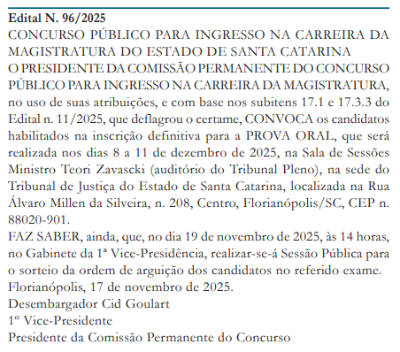 O Tribunal de Justiça de Santa Catarina (TJ SC) convocou os candidatos habilitados na inscrição definitiva do concurso para ingresso na Magistratura do Estado para a realização da prova oral, que acontecerá entre os dias 8 e 11 de dezembro. Veja o documento: