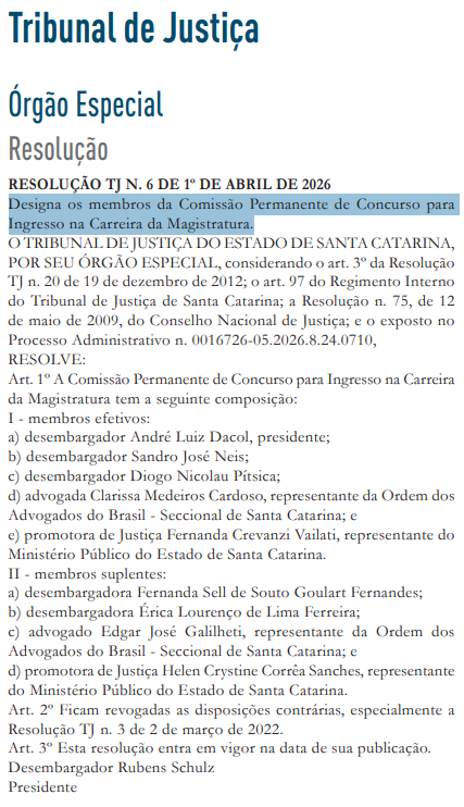 Anteriormente, em 12 de maio, o Tribunal de Justiça de Santa Catarina havia divulgado outra Portaria G1VP/TJSC nº 4, que designava a Comissão Examinadora responsável pela avaliações.