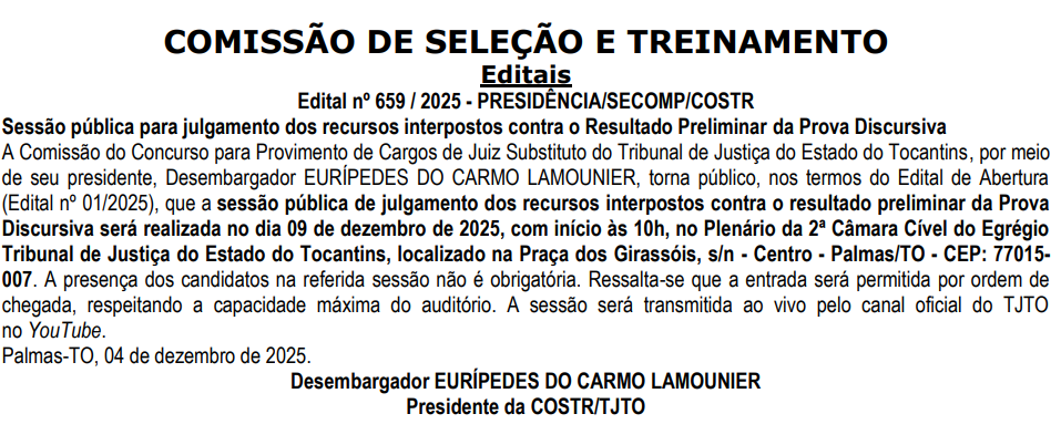 A presença dos candidatos não é obrigatória e a entrada será permitida por ordem de chegada, respeitando a capacidade do auditório. Para quem não puder comparecer, a sessão será transmitida ao vivo pelo canal oficial do TJTO no YouTube.