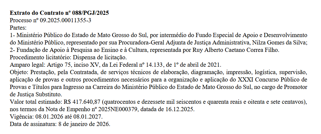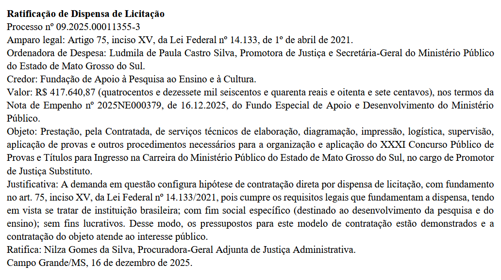 A Fundação de Apoio à Pesquisa ao Ensino e à Cultura (FAPEC) foi definida, via dispensa de licitação, como banca organizadora do XXXI Concurso Público para Promotor de Justiça do Ministério Público do Estado de Mato Grosso do Sul (MP MS).