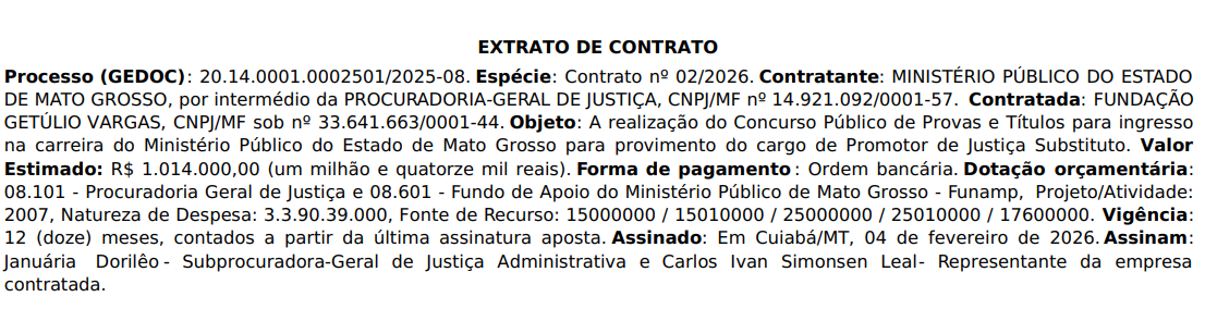 A FGV foi oficialmente definida como a banca organizadora da seleção que visa o preenchimento de 8 vagas imediatas + CR e iniciais de R$ 37,7 mil. Veja o extrato do contrato: