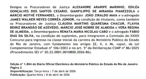 O MP RJ publicou a composição da Comissão do XXXIX Concurso para ingresso na classe inicial da carreira de Promotor de Justiça.