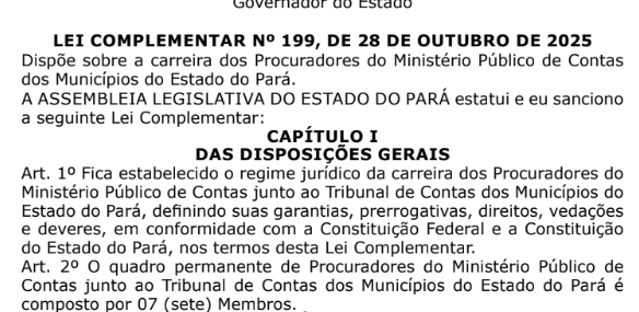O governador Helder Barbalho sancionou, em 28 de outubro de 2025, a Lei Complementar nº 199, que institui o regime jurídico da carreira dos Procuradores do Ministério Público de Contas dos Municípios do Estado do Pará (MPC-PA).