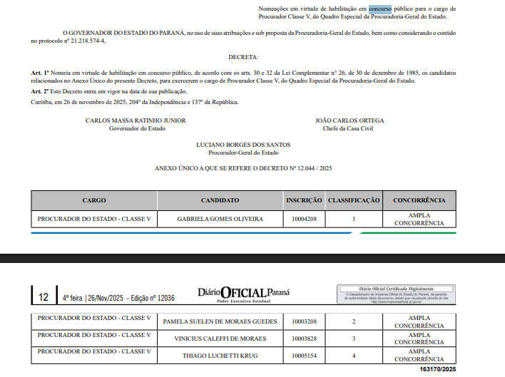 O Conselho Superior da Procuradoria-Geral do Estado do Paraná (PGE PR) publicou a homologação do resultado final e as nomeações do XVI Concurso Público para ingresso na carreira de Procurador do Estado. Veja o documento: