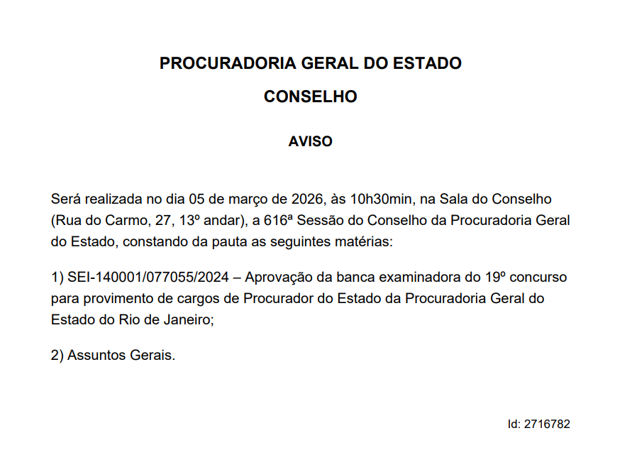 A Procuradoria-Geral do Estado do Rio de Janeiro publicou aviso informando a realização da 616ª Sessão do Conselho da instituição, marcada para o dia 5 de março de 2026, às 10h30.