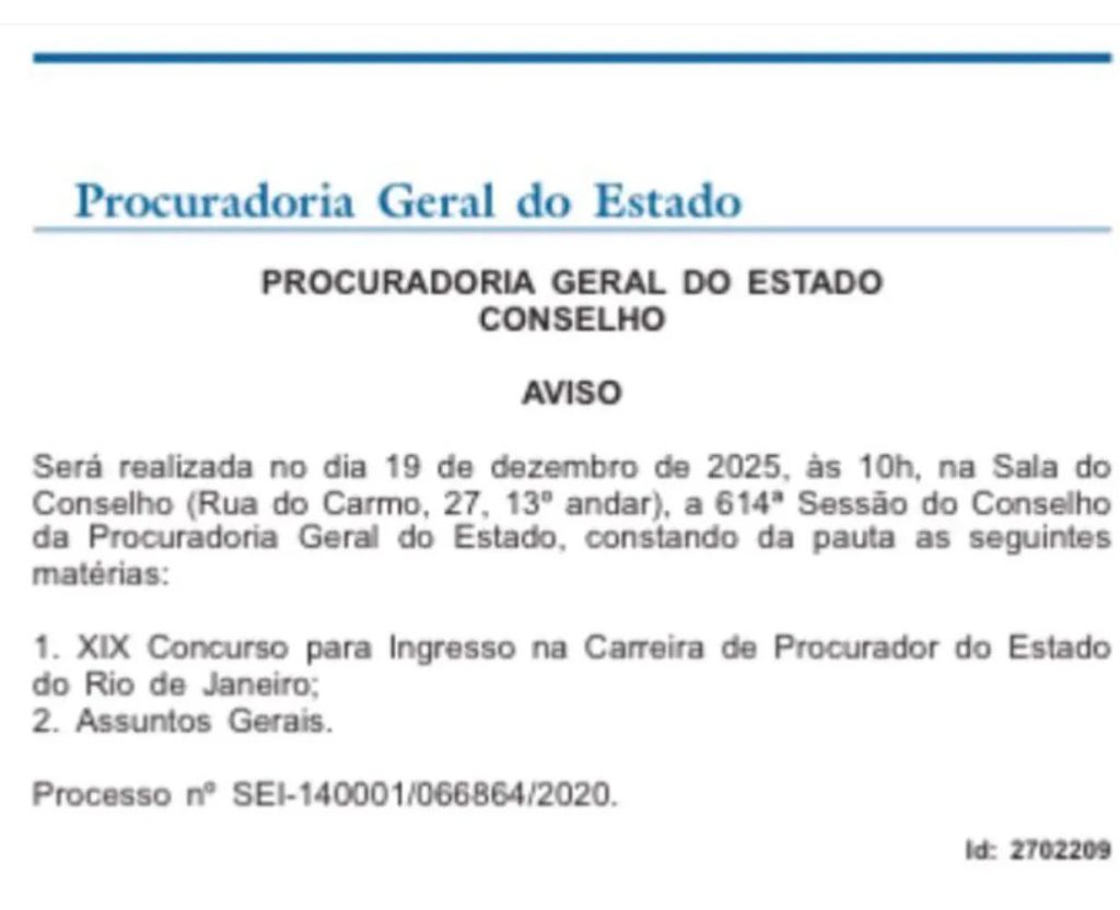 Além disso, o XIX Concurso para ingresso na carreira de Procurador do Estado foi tratado na 614ª Sessão do Conselho da PGE, no dia 19 de dezembro de 2025, às 10h. Historicamente, essa etapa antecede decisões relevantes sobre continuidade do certame, ajustes finais e encaminhamentos internos.