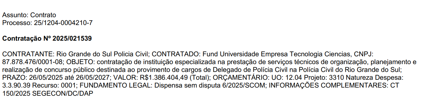 O último edital ofertou sete vagas para o cargo, com remuneração inicial de R$ 20.353,06. A organização do certame foi realizada pela FUNDATEC.