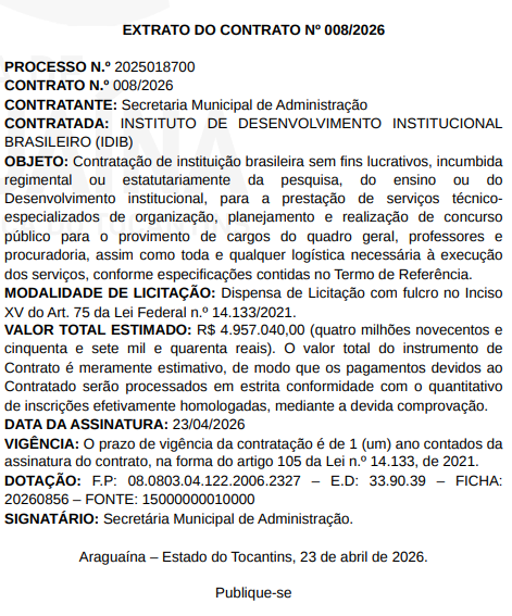 A Prefeitura de Araguaína, em Tocantins, deu mais um passo rumo à realização de novo concurso público ao formalizar a contratação do IDIB como banca organizadora e estruturar a gestão do contrato. Além disso, foi publicada portaria que designa servidores responsáveis pela fiscalização e acompanhamento da execução do certame. O certame ofertará 1 vaga imediata + 3 em cadastro reserva (CR). Veja o documento do contrato: