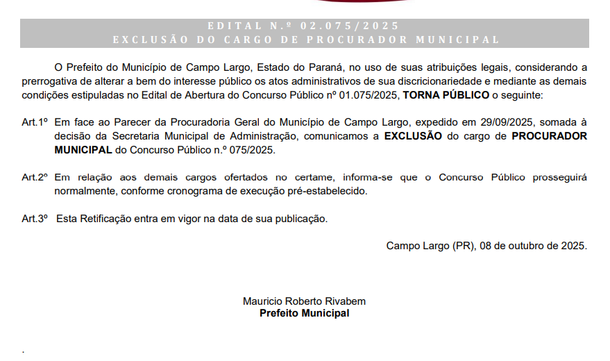 A Prefeitura de Campo Largo, no Paraná, excluiu o cargo de Procurador Municipal, do concurso que terá inscrições entre os dia 9 de outubro e 9 de novembro.