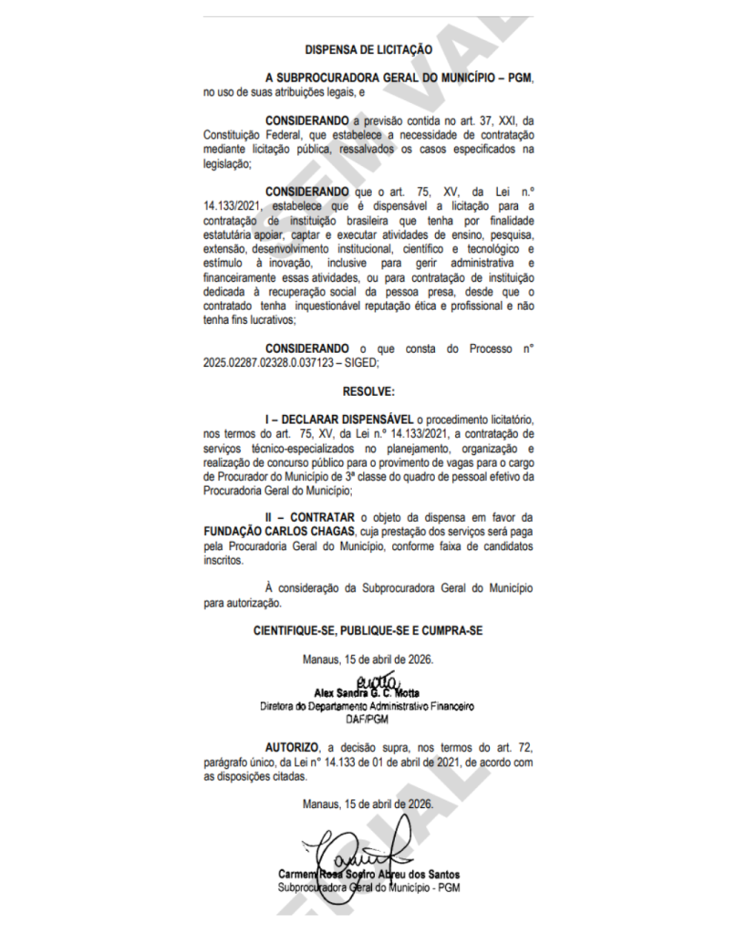 A Procuradoria Geral do Município de Manaus publicou dispensa de licitação que defina e Fundação Carlos Chagas como a organizadora do próximo Concurso PGM Manaus. Confira: