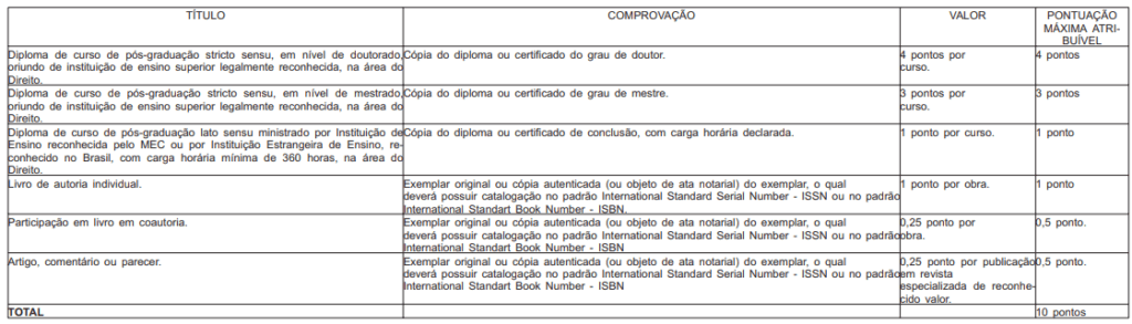 Por fim, haverá a Avaliação de Títulos, de caráter apenas classificatório, destinada aos aprovados na prova discursiva. Serão considerados diplomas de pós-graduação e demais certificados previstos no edital, enviados exclusivamente em formato digital no prazo estabelecido.