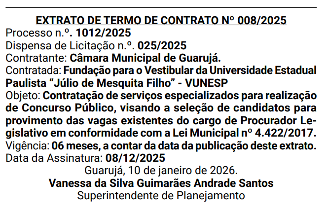 A Câmara Municipal de Guarujá, em São Paulo, oficializou a VUNESP como banca organizadora do concurso público para o cargo de Procurador Legislativo. A definição consta em extrato de contrato publicado neste mês, após dispensa de licitação. Veja o documento: