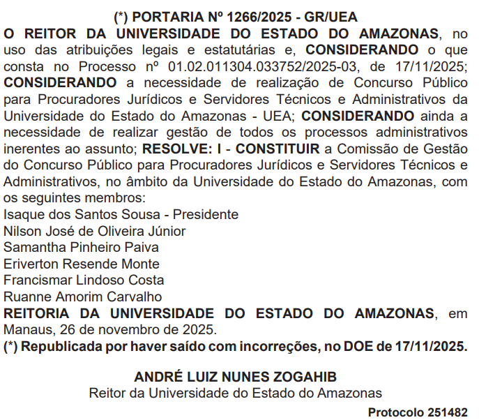 A Universidade do Estado do Amazonas (UEA) publicou a Portaria nº 1266/2025 – GR/UEA, republicada por correções, oficializando a Comissão de Gestão do Concurso Público para Procuradores Jurídicos. Veja o documento: