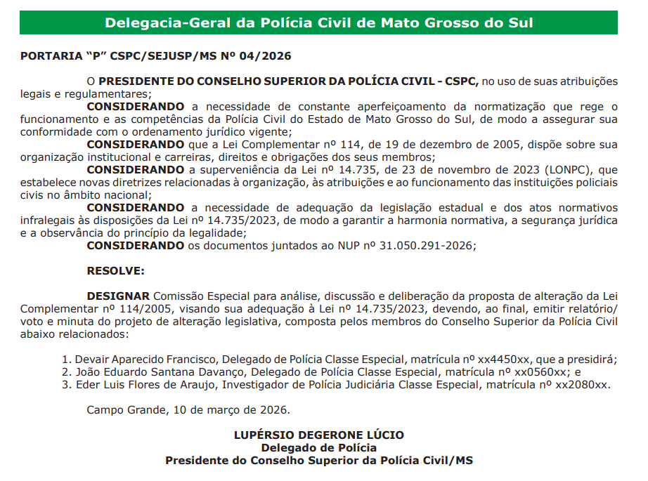 A Delegacia-Geral da Polícia Civil de Mato Grosso do Sul (PC MS) publicou a portaria que cria uma Comissão Especial para revisar e propor alterações na Lei Complementar nº 114/2005, que regula a estrutura e as carreiras da instituição. Veja o documento: