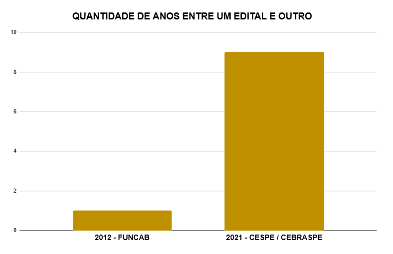 - Histórico dos concursos: os últimos editais foram publicados em 2012 e 2021, indicando intervalo de nove anos entre os certames, o que sugere ciclos longos, embora relativamente identificáveis.