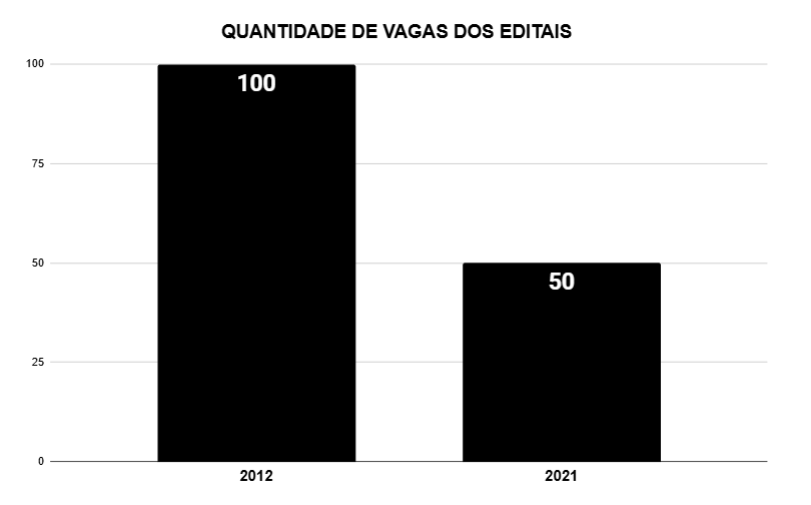- Redução no número de vagas: a oferta caiu de 100 vagas em 2012 para 50 vagas em 2021, evidenciando provimento mais limitado.