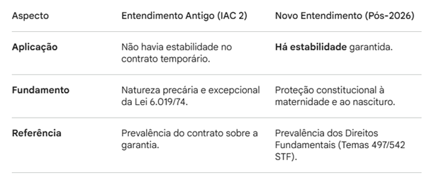 No julgamento do Incidente de Assunção de Competência nº 2 (IAC 2), em 2019, o tribunal fixou a tese de que a estabilidade provisória da gestante (prevista no Art. 10, II, “b” do ADCT) não se aplicava aos contratos temporários da Lei 6.019/74.