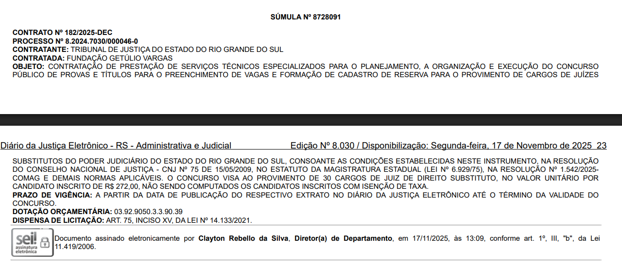 O Tribunal de Justiça do Rio Grande do Sul (TJ RS) divulgou o extrato do contrato com a Fundação Getúlio Vargas (FGV) para organizar o concurso público destinado ao provimento de 30 vagas, mais formação de cadastro reserva, de Juiz de Direito Substituto. Confira: