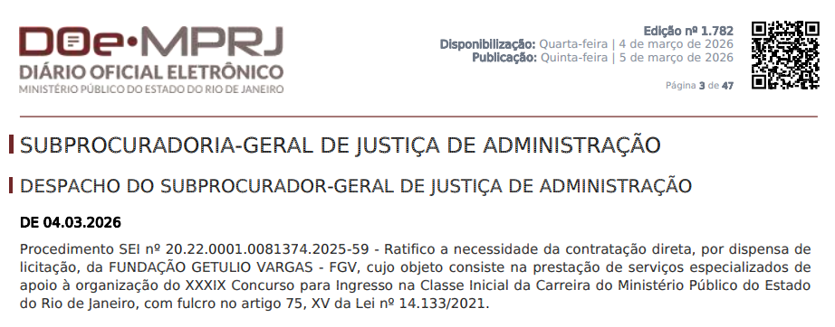 O Ministério Público do Rio de Janeiro (MP RJ) confirmou a contratação da Fundação Getúlio Vargas (FGV) para apoiar a organização do 39º concurso para ingresso na classe inicial da carreira de Promotor. Confira o documento: