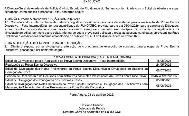 A prova discursiva do concurso para Delegado do Rio Grande do Sul, que seria aplicada no dia 26 de abril de 2026, foi cancelada.