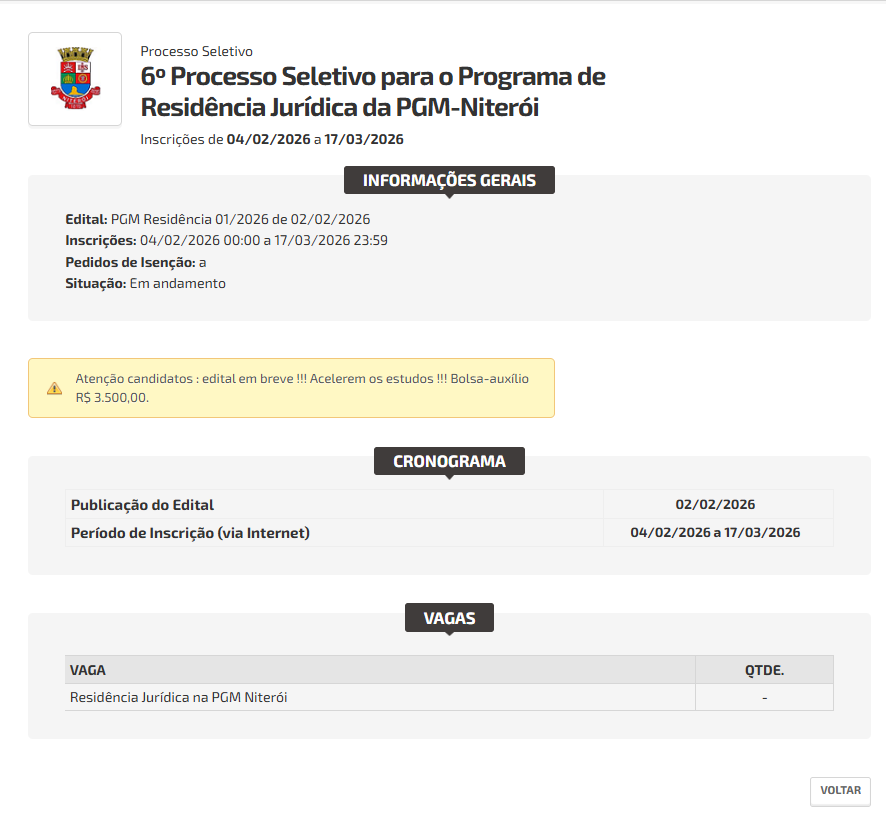 Atenção! O Programa de Residência Jurídica da PGM Niterói terá edital publicado em 02 de fevereiro de 2026. A informação está na página oficial do certame que acaba de ser criada.