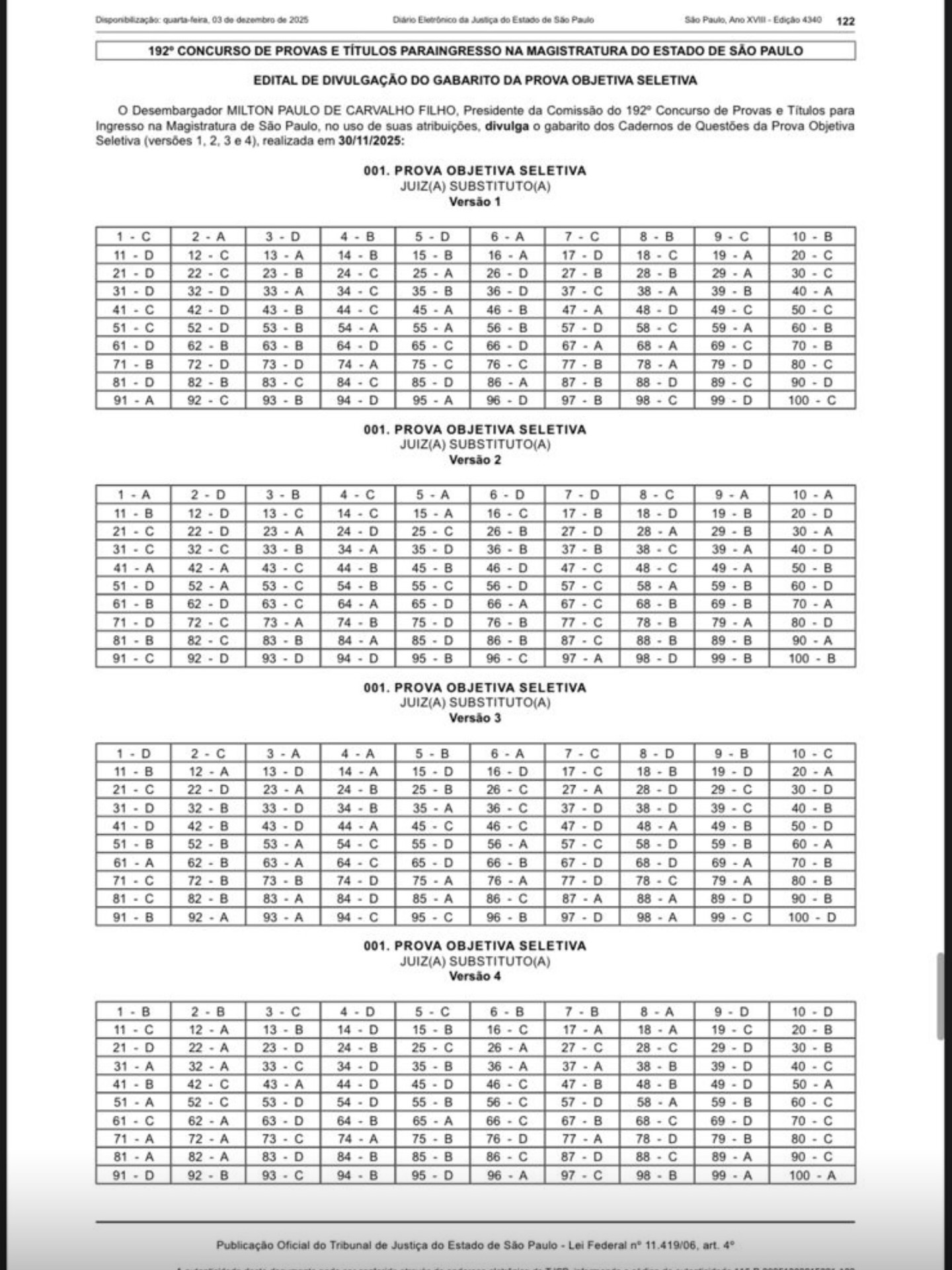 O Tribunal de Justiça de São Paulo (TJSP) divulgou hoje, 2 de dezembro de 2025, o gabarito preliminar da Prova Objetiva Seletiva do 192º Concurso da Magistratura SP.