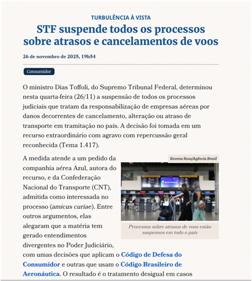 Em breve síntese, em decisão que reverbera intensamente tanto no setor de aviação civil quanto na esfera dos direitos do consumidor, o ministro Dias Toffoli, do Supremo Tribunal Federal, determinou em 26 de novembro de 2025 a suspensão nacional de todos os processos judiciais que versem sobre responsabilidade civil de companhias aéreas por cancelamento, alteração ou atraso de voos.