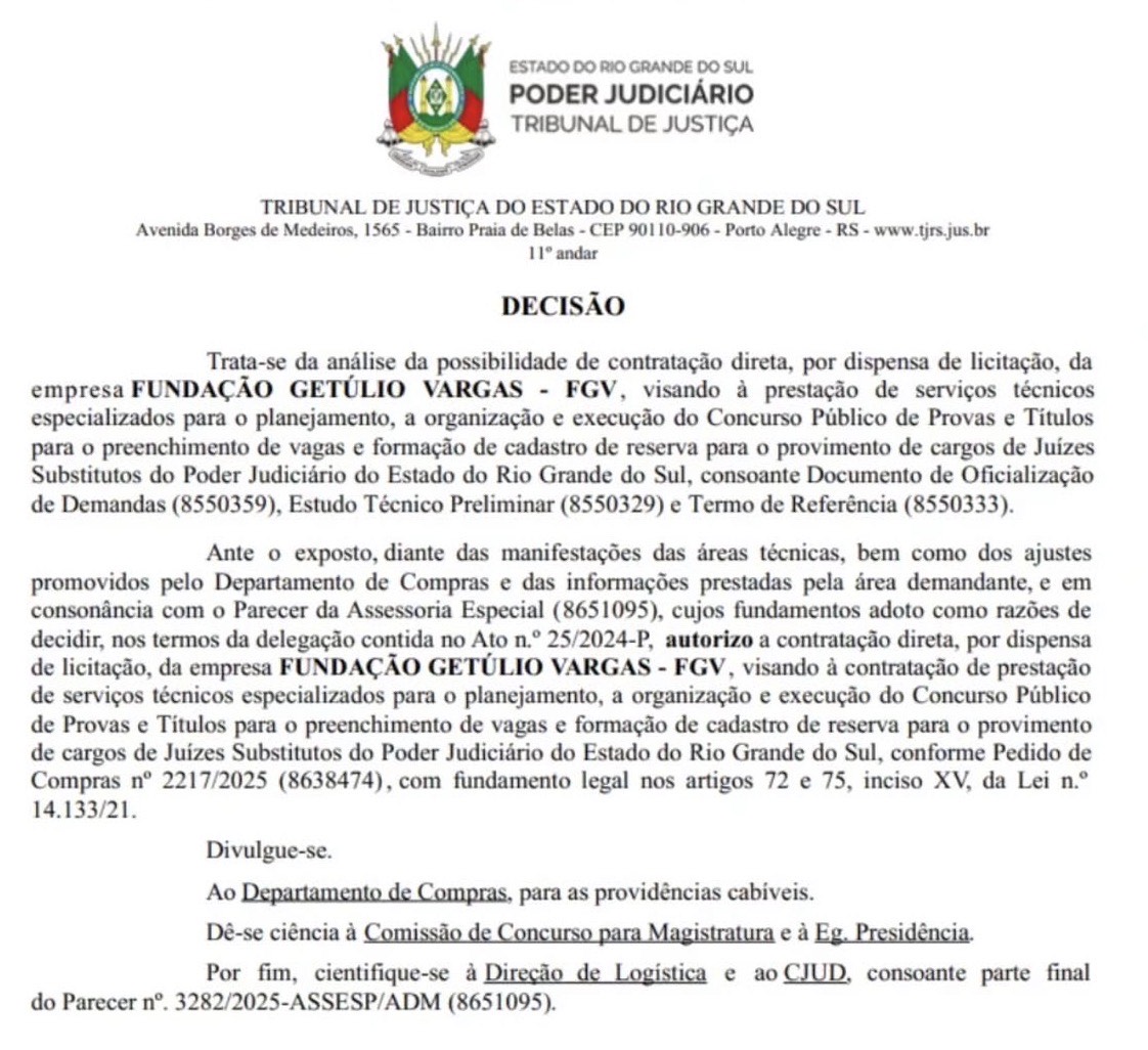 O Tribunal de Justiça do Estado do Rio Grande do Sul (TJ RS) autorizou a contratação direta, por dispensa de licitação, da Fundação Getúlio Vargas (FGV) para organizar o concurso destinado ao preenchimento de vagas e formação de cadastro de reserva para cargos de Juízes Substitutos. Veja o documento: