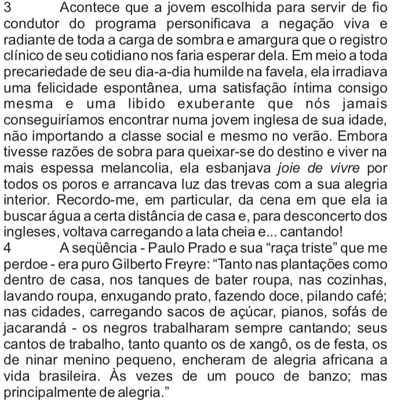 “Acontece que a jovem escolhida para servir de fio condutor do programa personificava a negação viva e radiante de toda a carga de sombra e amargura que o registro clínico de seu cotidiano nos faria esperar dela” (3º parágrafo);