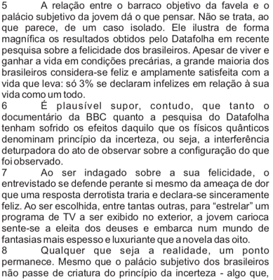“A relação entre o barraco objetivo da favela e o palácio subjetivo da jovem dá o que pensar” (5º parágrafo);